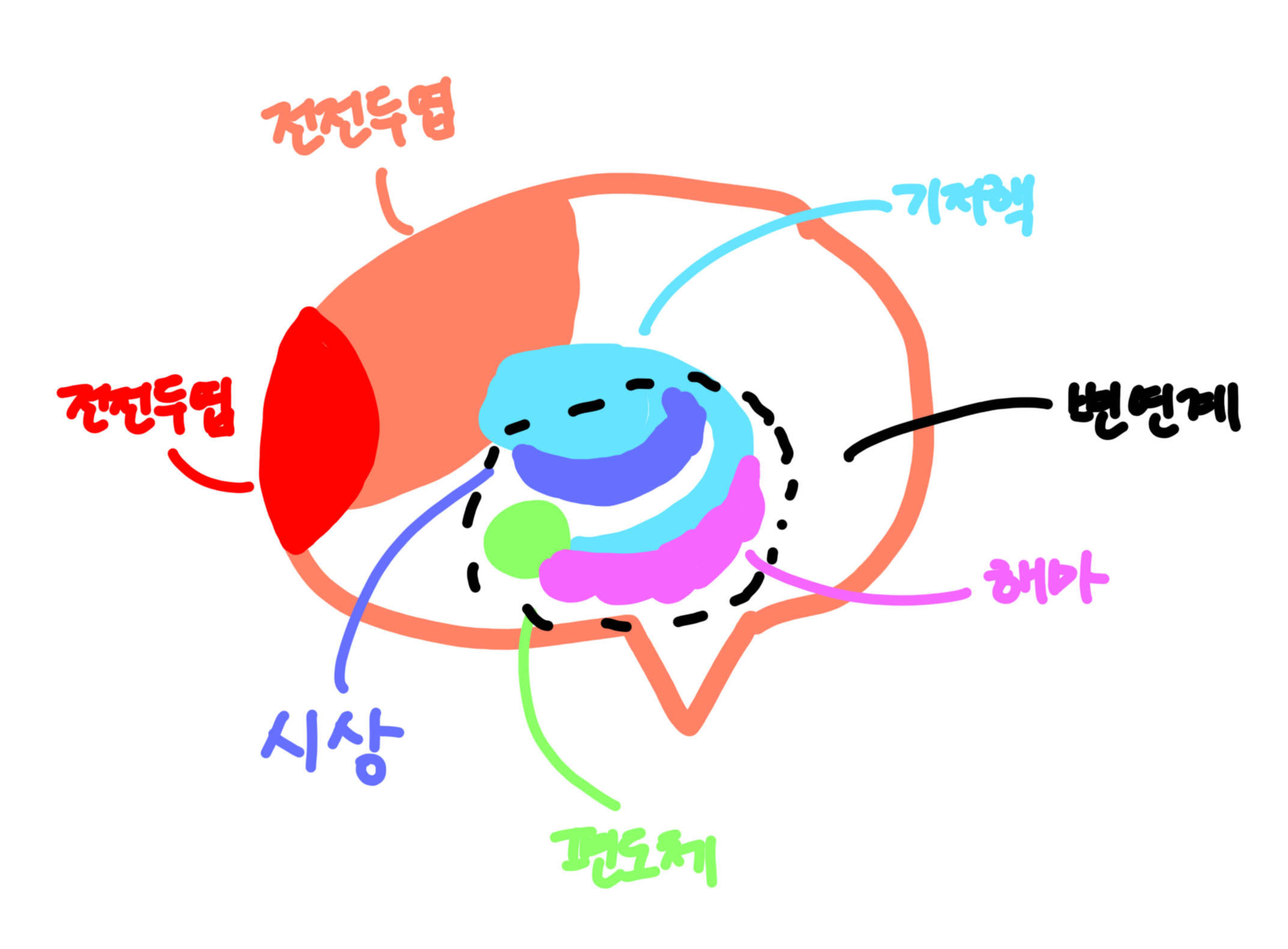 - 변연계: 감정의 뇌라고 부르는 편도체, 시상, 해마를 포함하는 영역으로 감, 욕구, 본능, 충동성을 조절.
